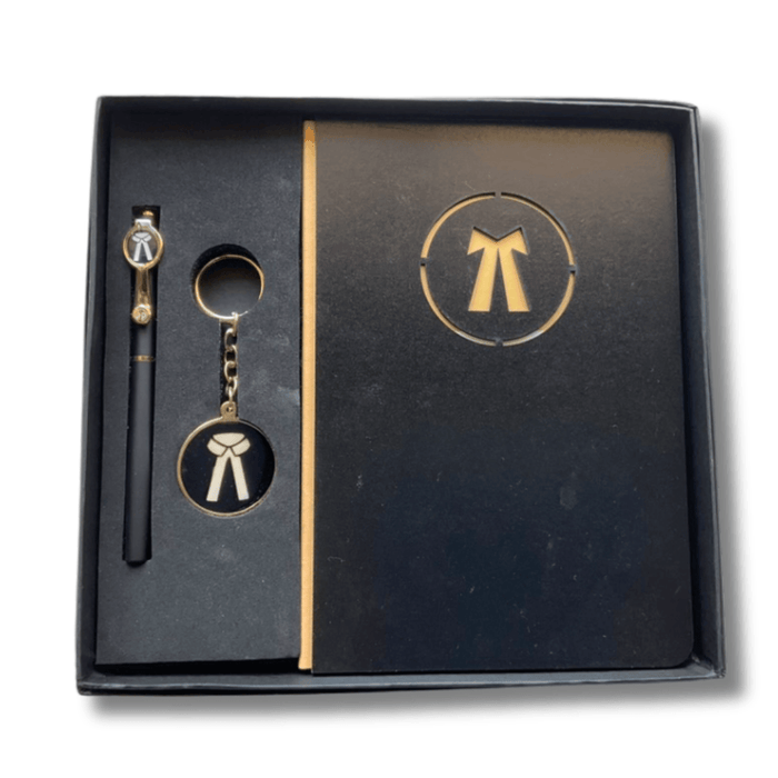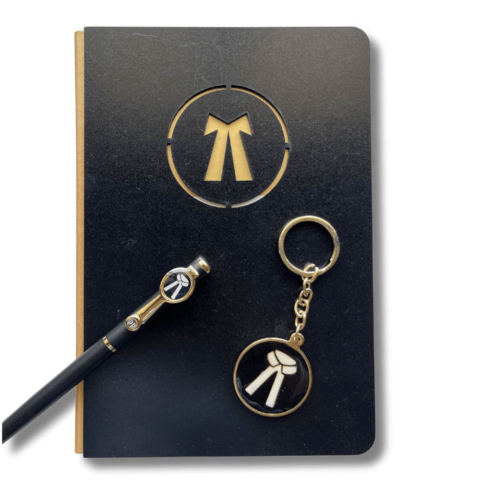 Notebook: A matte black, hardbound notebook featuring a laser-cut Advocate's band symbol. The precision-cut design reveals a gold background, offering a subtle yet striking contrast that signifies professionalism and prestige.