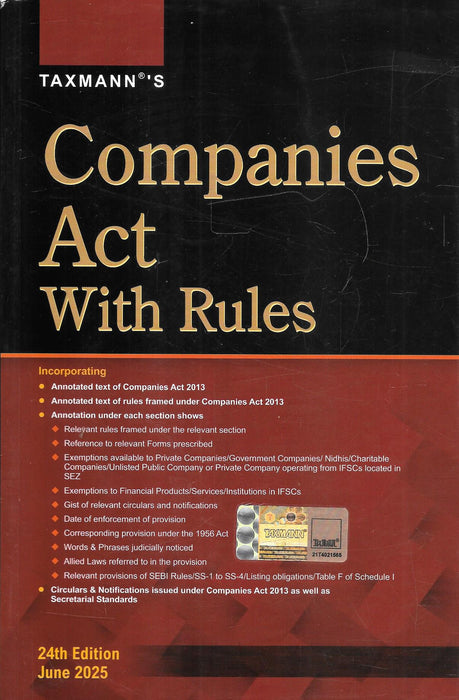 The 24th Edition of Companies Act with Rules by Taxmann is a trusted reference guide for corporate legal professionals, offering annotated text of the Companies Act, 2013 along with relevant rules, forms, and updates. This edition integrates judicial interpretations, SEBI provisions, circulars, and secretarial standards to provide a thorough legal roadmap for corporate governance and compliance in India.
