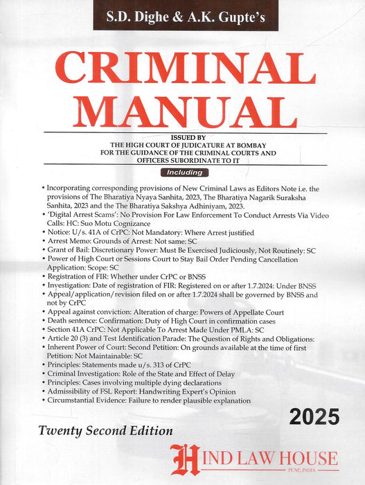 The 2025 edition of the Criminal Manual by S.D. Dighe and A.K. Gupte, issued by the High Court of Judicature at Bombay, serves as an authoritative reference for criminal courts and officers. It includes provisions from the Bharatiya Nyaya Sanhita, Bharatiya Nagarik Suraksha Sanhita, and Bharatiya Sakshya Adhiniyam, 2023, along with key Supreme Court and High Court rulings.