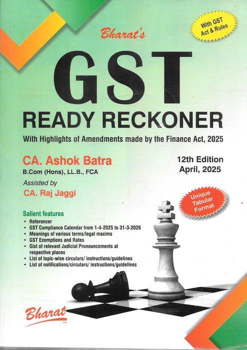 The "GST Ready Reckoner" by CA. Ashok Batra is a comprehensive guide that provides an in-depth analysis of the Goods and Services Tax (GST) laws in India. This 12th edition, updated as of April 2025, incorporates the latest amendments and notifications, serving as a valuable resource for professionals and businesses navigating the complexities of GST compliance.lawbookshop.net+4Bharat Laws+4CAclubindia+4