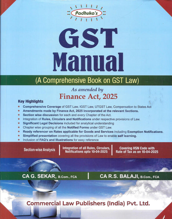In a world of ever-evolving tax laws, Paduka’s GST Manual stands out as one of the most trusted and comprehensive resources on Goods and Services Tax. This edition, thoroughly updated as per the Finance Act, 2025, delivers a complete analysis of GST, IGST, UTGST, and Compensation to States Acts, with rule-wise commentary, notified forms, HSN Codes, and rate references—all integrated in a single volume.