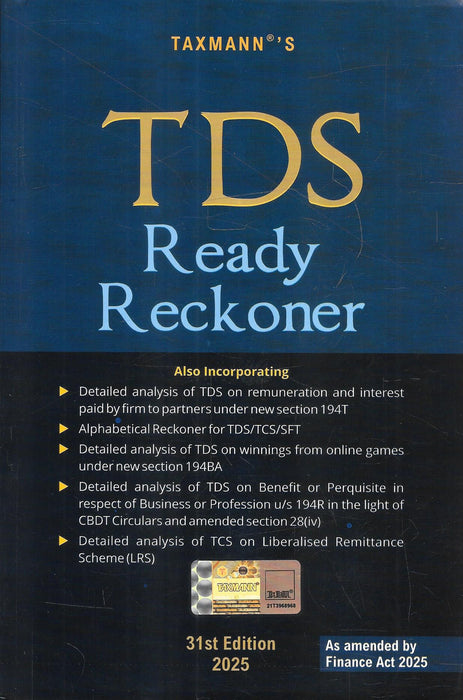 TDS Ready Reckoner is a comprehensive, user-friendly guide that covers the entire scope of TDS, TCS, and SFT provisions, updated with the latest amendments introduced by the Finance Act 2025. It provides a practical approach through illustrations, FAQs, and detailed commentary on newly introduced sections like 194T and 194BA, as well as updates to sections 194R and 28(iv).