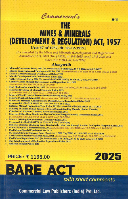 This updated Bare Act with short comments provides the full text of the Mines and Minerals (Development and Regulation) Act, 1957 (Act 67 of 1957), comprehensively amended by the Mines and Minerals (Amendment) Act, 2023 and related notifications till 2024. The edition includes all allied rules, recent amendments, and practical additions essential for understanding mining laws and regulations in India.